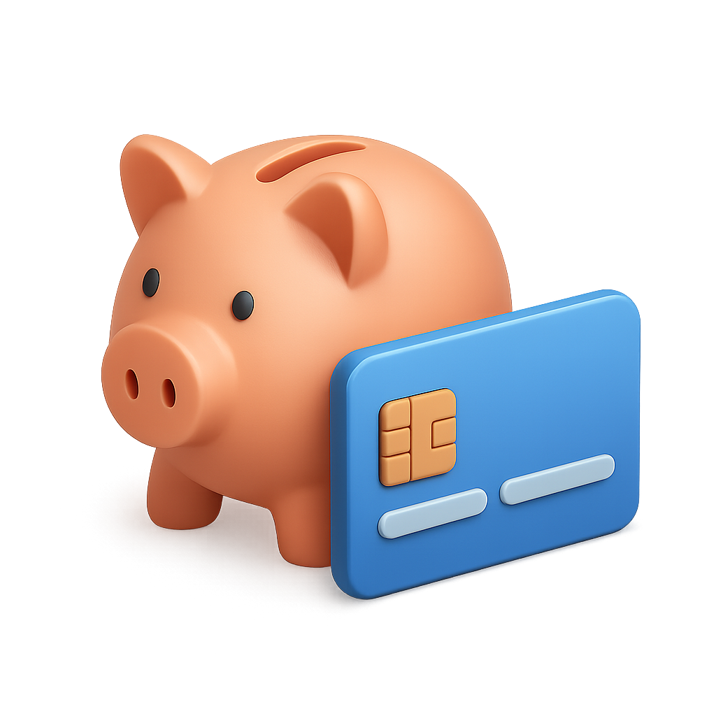 A stylized 3D piggy bank in a three-quarter perspective, accompanied by a credit card. The design features a glossy finish and a transparent background, enhancing its volumetric appeal.