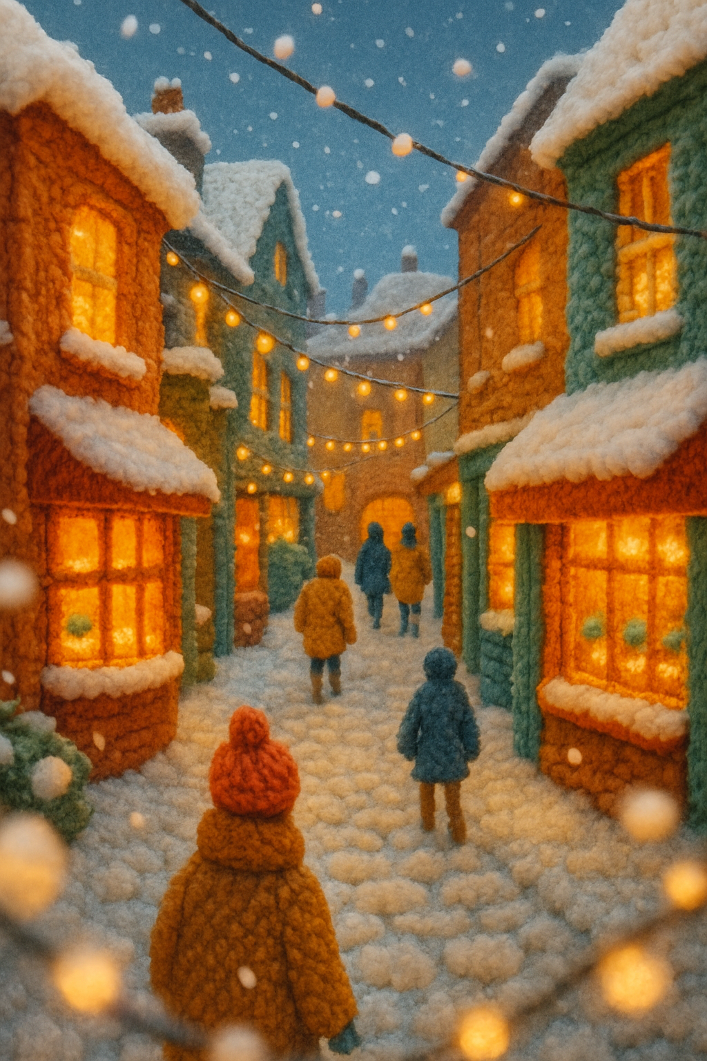 /Collection: /by davooda/Type: PNG/A charming winter street scene in Brighton, depicted in a cozy knitted style. The image features vibrant colors, snowflakes falling, and warm glowing lights from the shops. Small figures stroll along the fluffy, snow-covered lane, creating a festive atmosphere.
