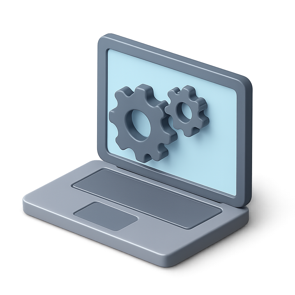 A stylized 3D representation of a laptop featuring gears on its screen, designed with a three-quarter isometric view and a sleek, modern aesthetic.