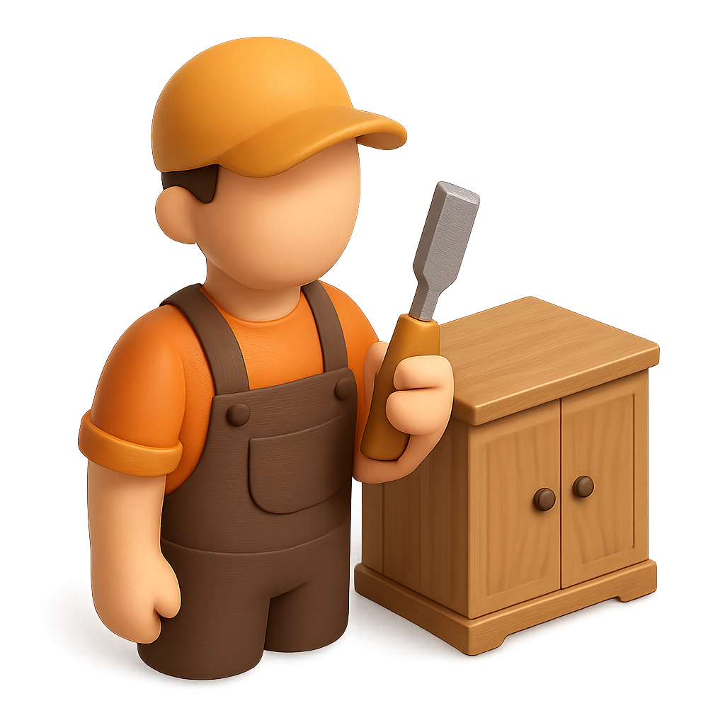 A stylized 3D icon of a cabinet maker holding a chisel next to a wooden cabinet. The figure is in a three-quarter view with a transparent background, showcasing a volumetric design.