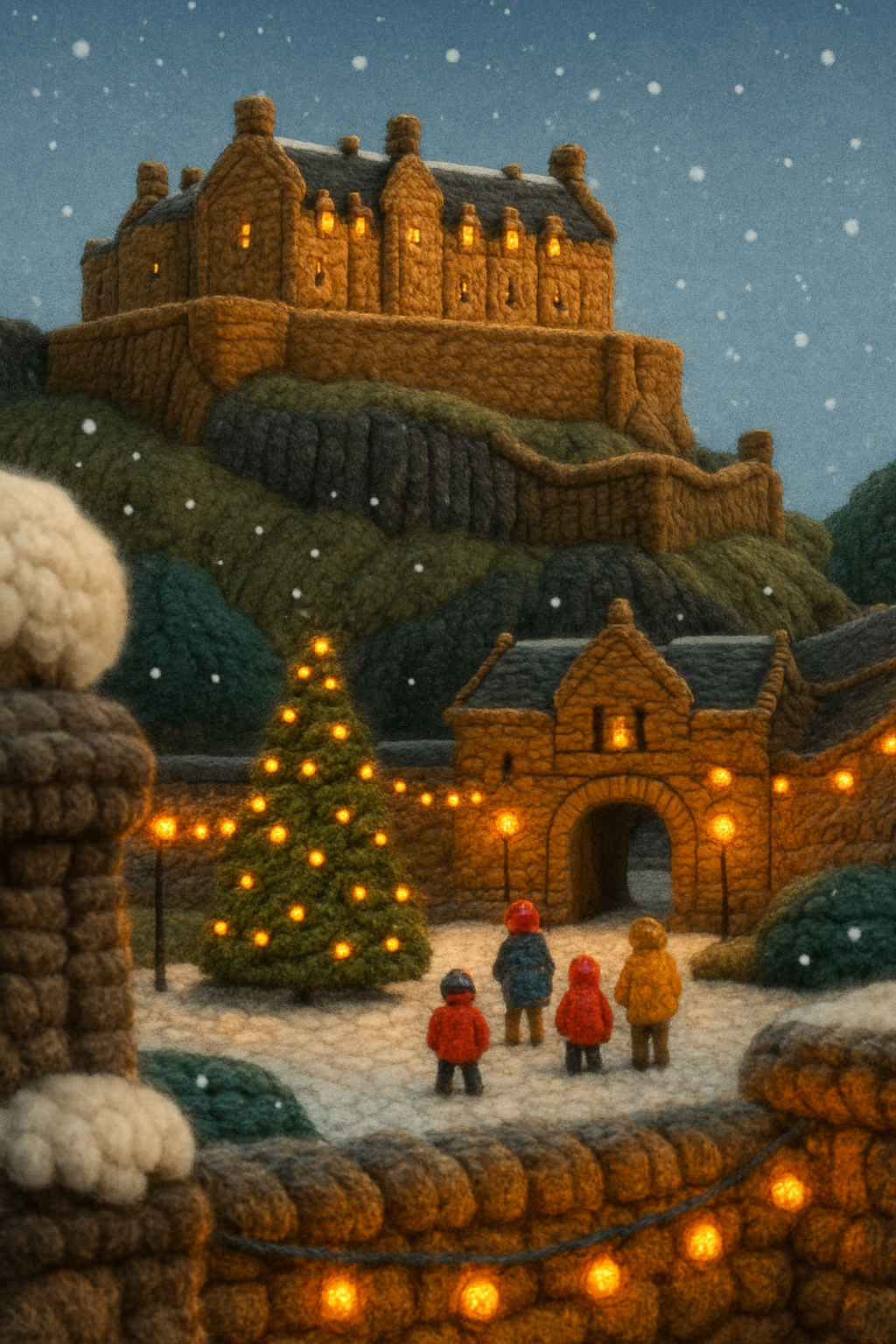 A charming 3D scene of Edinburgh Castle, crafted to resemble a cozy woolen texture. The foreground features a festive tree with lights, while tiny figures enjoy the snowy ambiance.