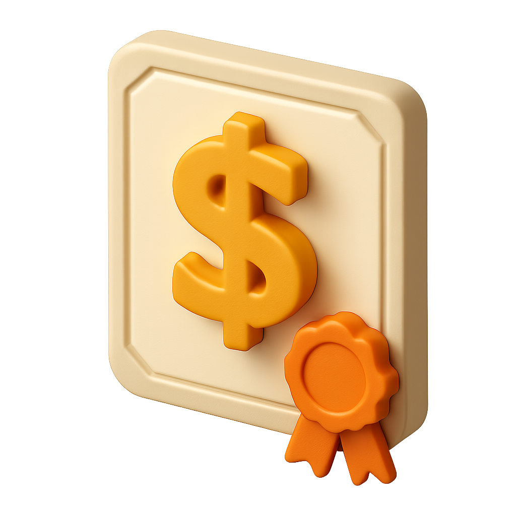 A 3D icon featuring a dollar sign on a certificate, designed in a three-quarter view with a volumetric effect. The certificate is complemented by a ribbon, all set against a soft gradient background.