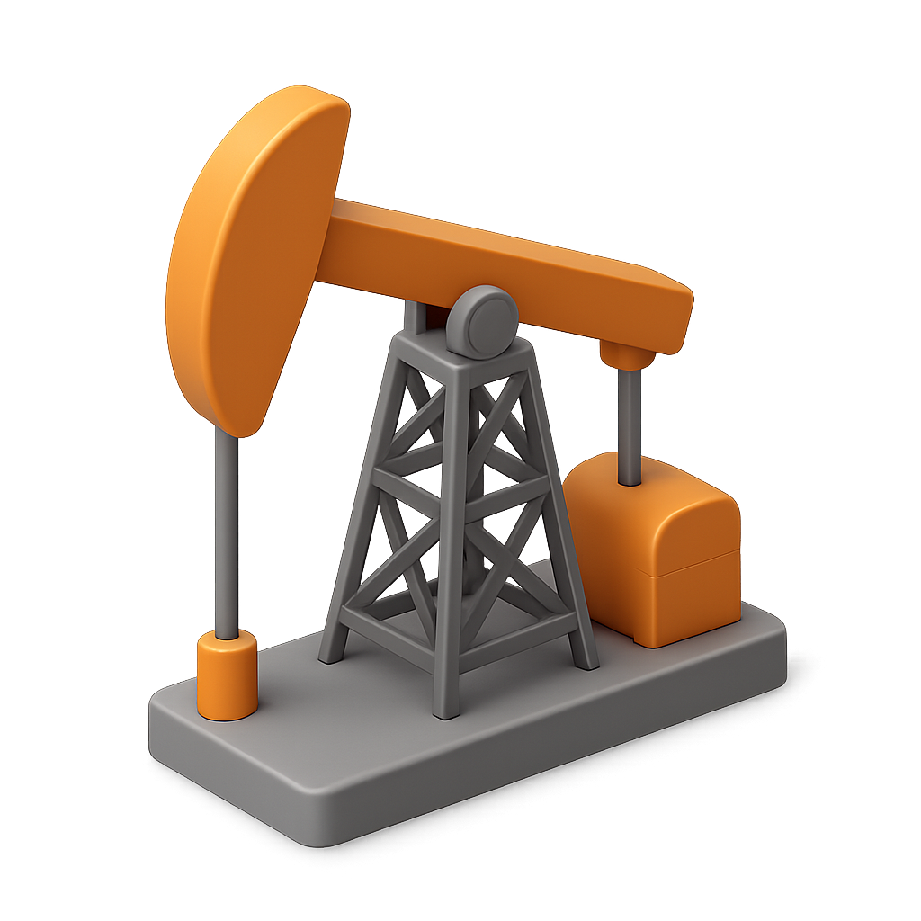 A vibrant 3D icon of an oil drilling rig, featuring a stylized design with a transparent background. The rig showcases a three-quarter view and isometric perspective, highlighting its volumetric feel.