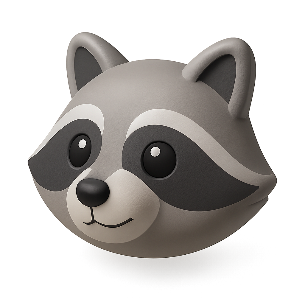 A cute, stylized raccoon face rendered in 3D with a transparent background. The isometric design showcases the raccoon's distinctive masked features in a three-quarter view.