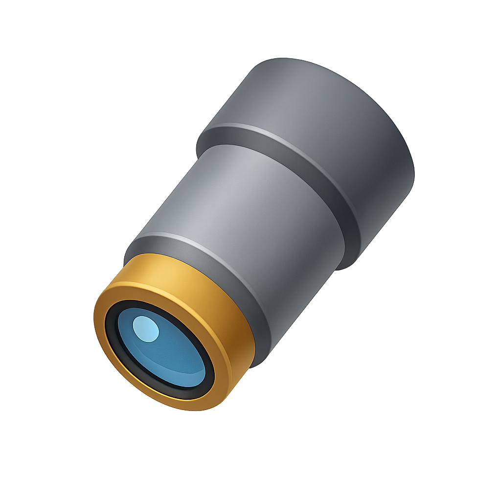 A sleek 3D icon of a microscope lens, featuring a transparent background and a volumetric isometric view. The lens is detailed with metallic shades and a glowing effect.