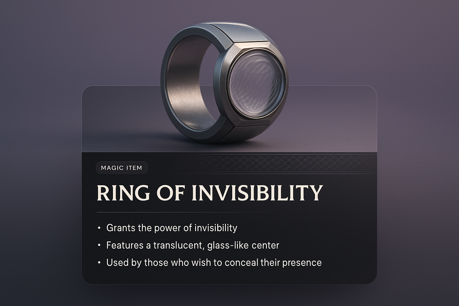 A stunning 3D illustration of a ring of invisibility featuring a sleek design, translucent center, and modern aesthetic. The image includes a stylish overlay with descriptive text.