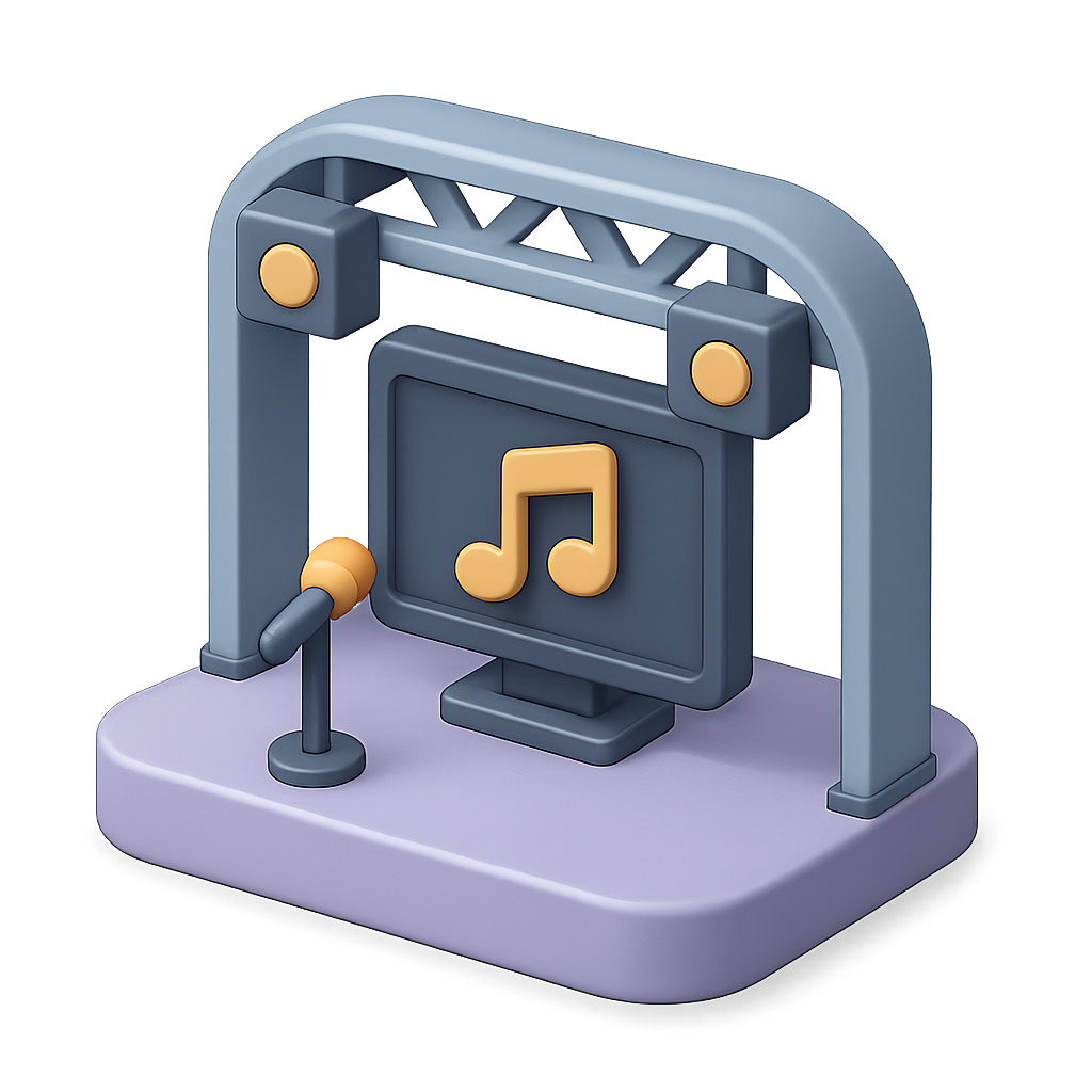 A vibrant 3D icon of a concert stage featuring a microphone and a screen with a music note. Designed with an isometric view, it showcases a modern aesthetic perfect for virtual concerts.