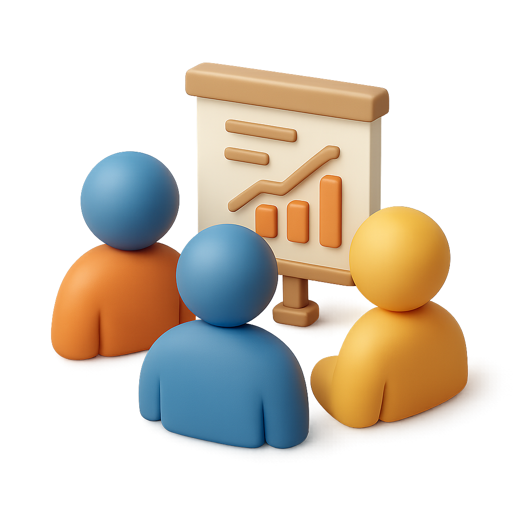 A 3D icon depicting three stylized figures in vibrant colors, engaged in a project discussion. They face a presentation board displaying a graph, suggesting collaboration and analysis.