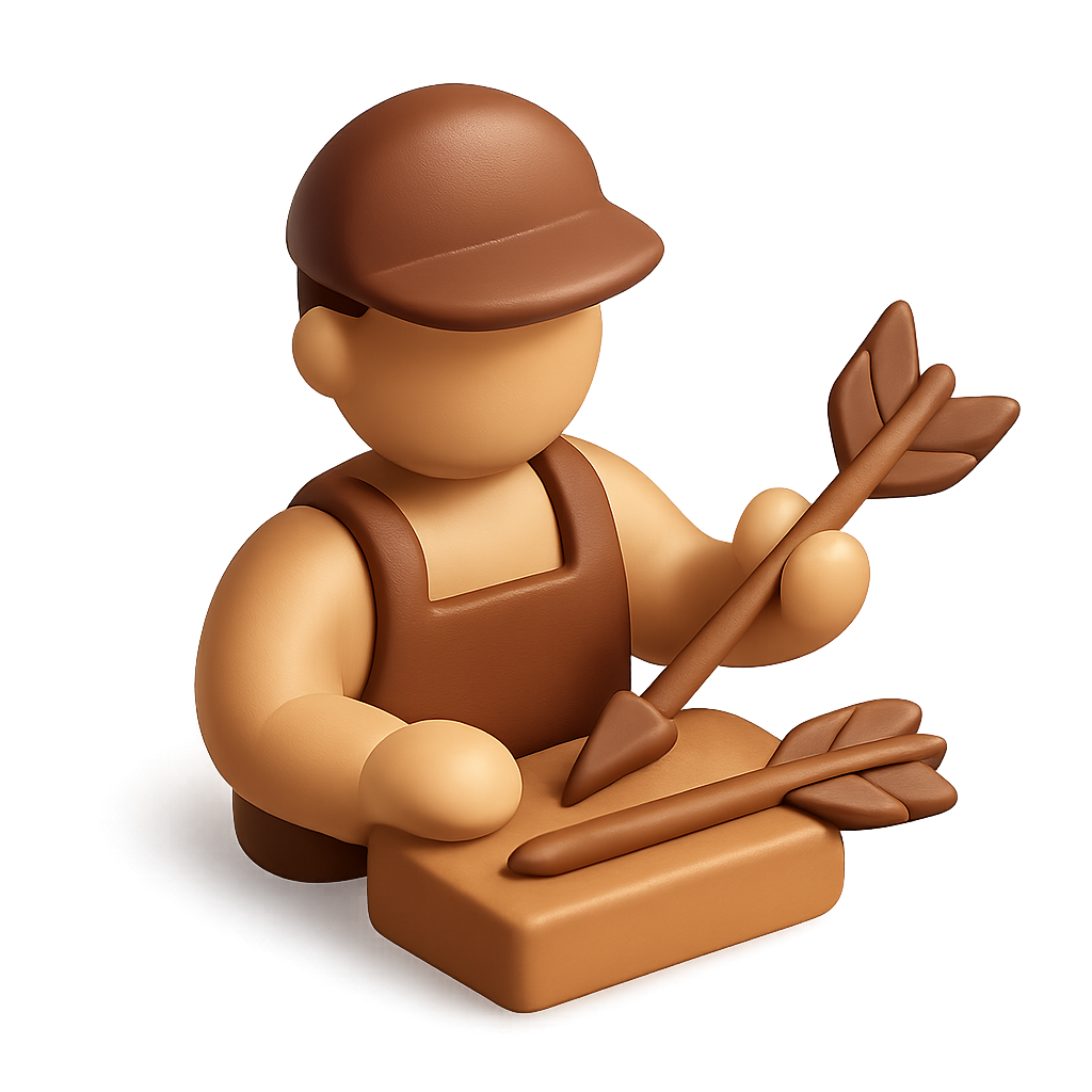 /Collection: /by davooda/Type: PNG/This image features a stylized 3D fletcher, depicted as a simplified figure crafting arrows. The character holds arrows and is set against a warm gradient background, enhancing its volumetric appearance.