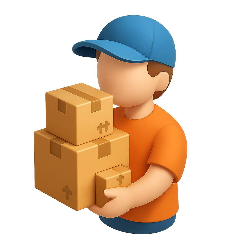 A 3D stylized figure of a person wearing a cap and an orange shirt, holding multiple packages in a three-quarter isometric view, set against a gradient background.