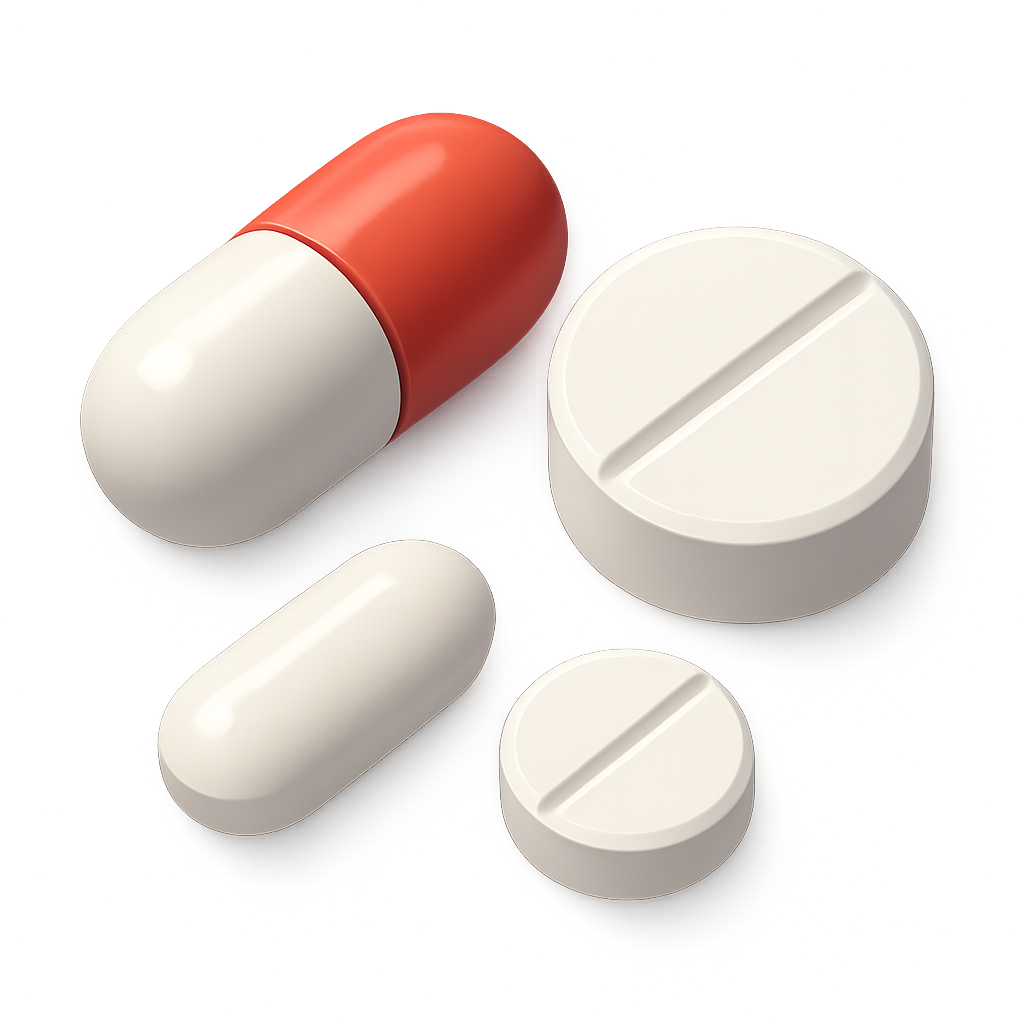 /Collection: /by davooda/Type: PNG/A visually striking collection of 3D pills and tablets in various sizes and shapes, set against a softly blurred background. The design includes a red-capped capsule and white tablets, showcasing a modern, isometric style.