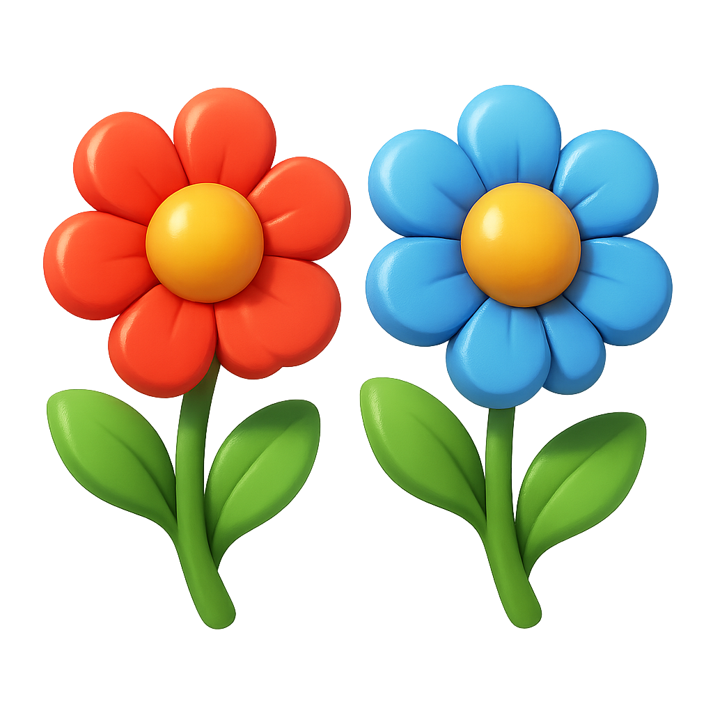 /Collection: /by davooda/Type: PNG/This image features two vibrant, stylized flowers in a three-quarter view. One flower is red with a yellow center, and the other is blue with a yellow center, both set against a soft gradient background.