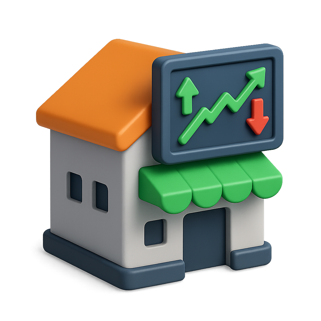 A 3D icon representing a market trading hall, featuring a stylized building with a colorful roof, shop awning, and a chart display showing upward and downward trends.