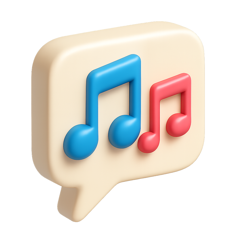 A 3D representation of a speech bubble featuring colorful musical notes. The design emphasizes a three-quarter view, showcasing a blend of vibrant colors and a soft, volumetric feel.