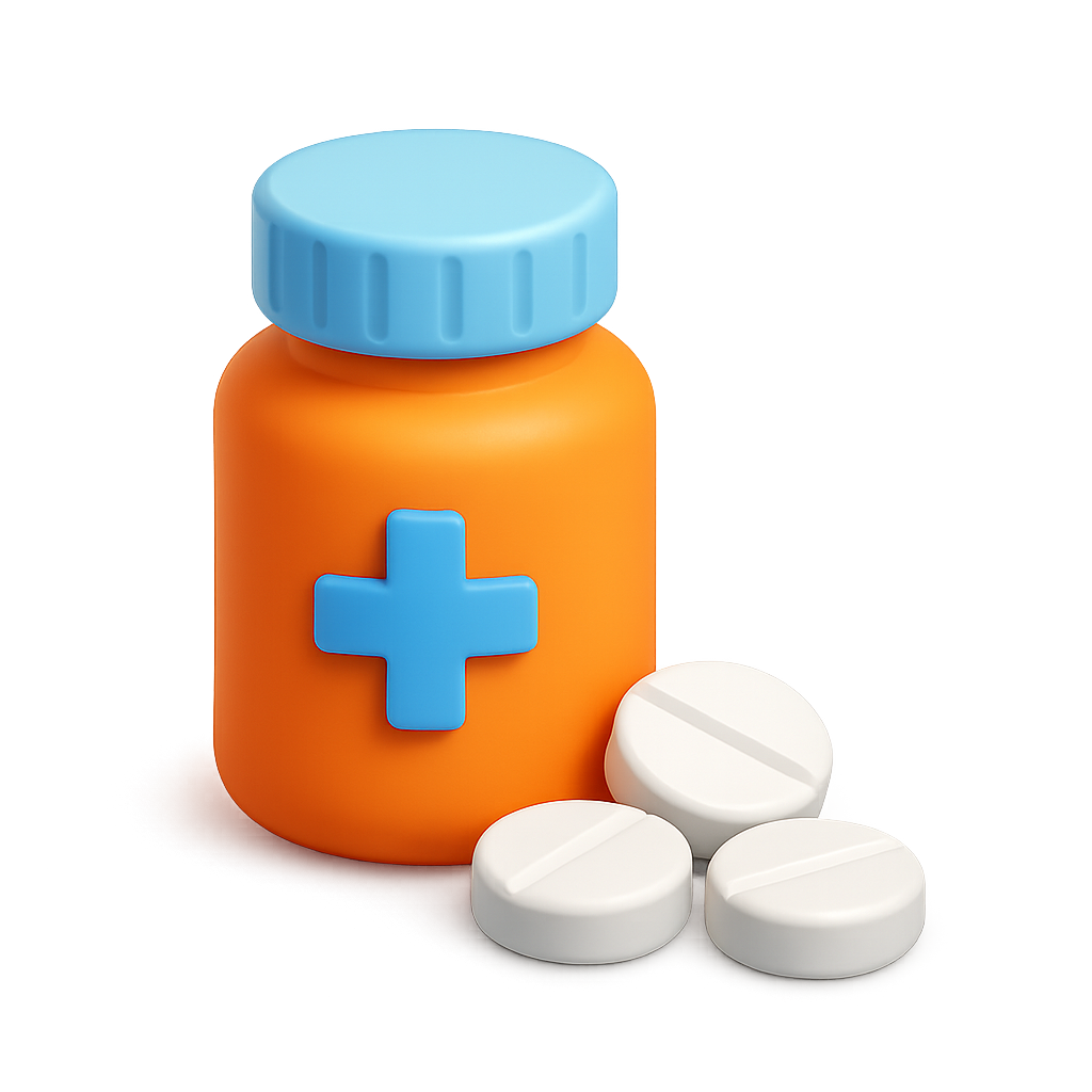 A vibrant 3D rendering of an orange pill bottle with a blue cap, accompanied by three white pills. The design has a modern, isometric feel.