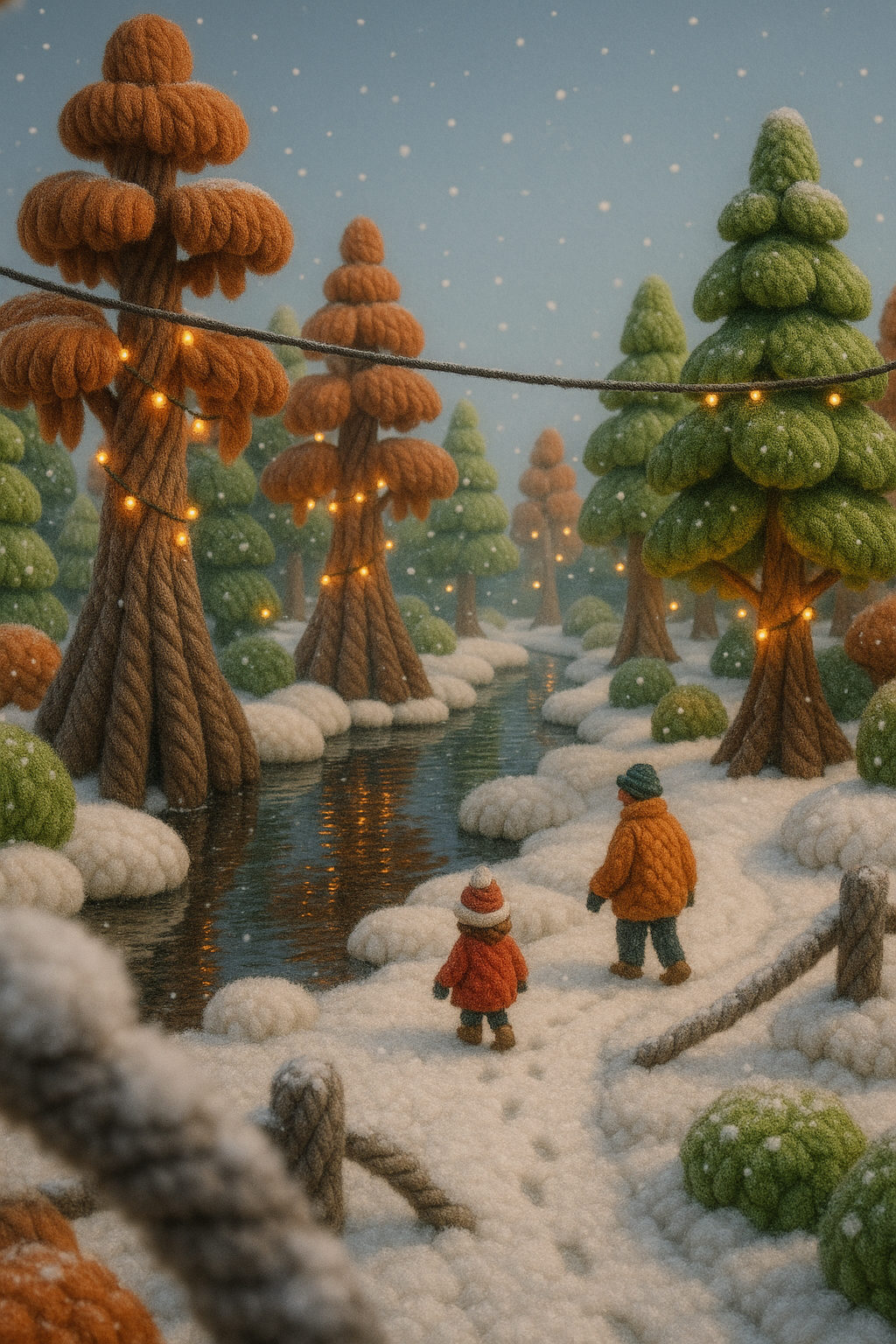 A charming 3D winter scene set in the Everglades, featuring fluffy, yarn-like trees and a gentle snowfall. Two small figures stroll along a snowy path, illuminated by warm lights.