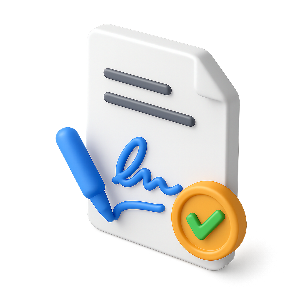 A vibrant 3D icon depicting a document with a digital signature and a checkmark, designed in an isometric view with a transparent background.