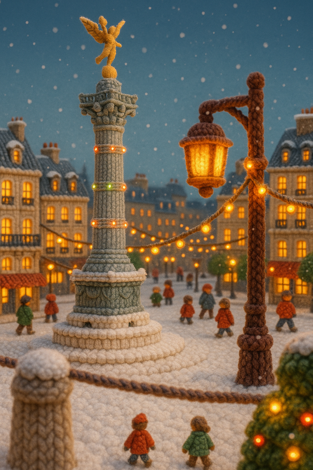 /Collection: /by davooda/Type: PNG/A charming 3D representation of Bastille, Paris, crafted from wool-like textures. The scene features a statue surrounded by small, cozy figures, festive lights, and gentle snowfall, creating a warm holiday atmosphere.