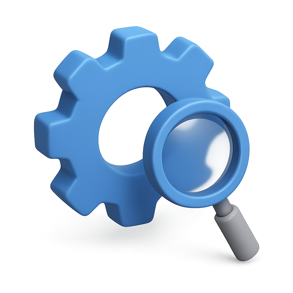 A stylized 3D icon featuring a blue gear paired with a magnifying glass, designed in an isometric view with a transparent background, creating a modern and volumetric appearance.