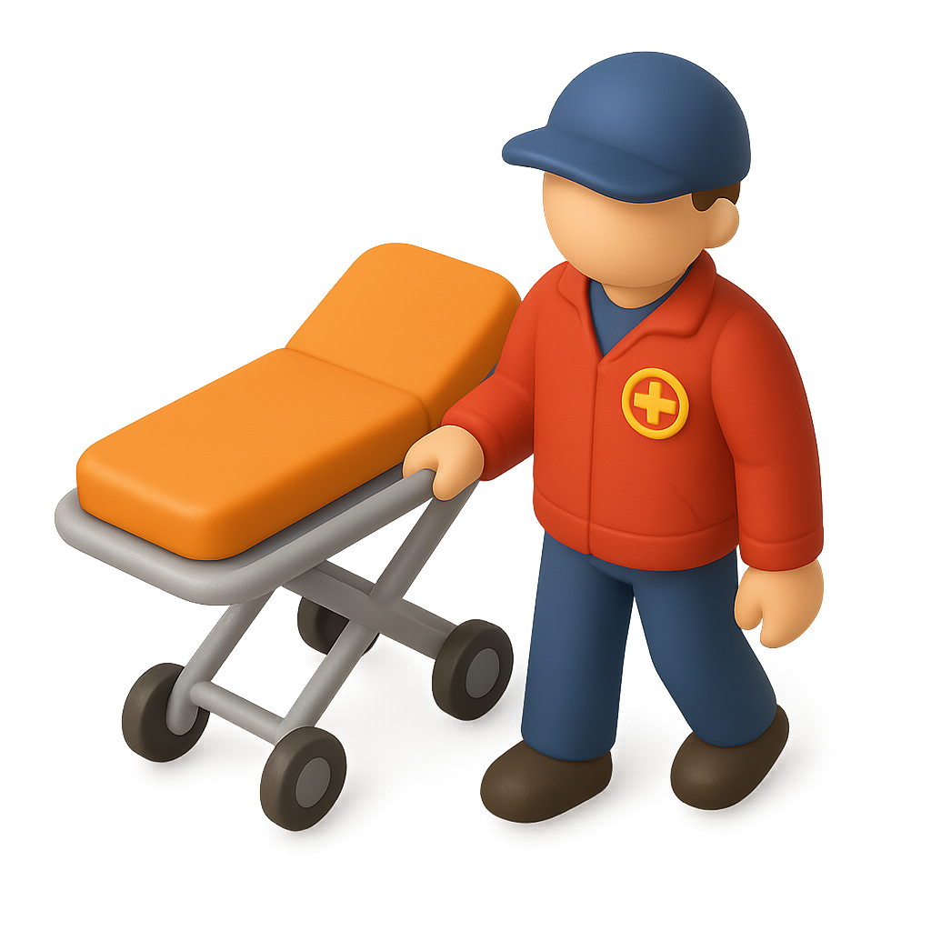 A stylized 3D icon depicting a paramedic in a red jacket pushing a stretcher. The design features a three-quarter view and a vibrant, volumetric style.