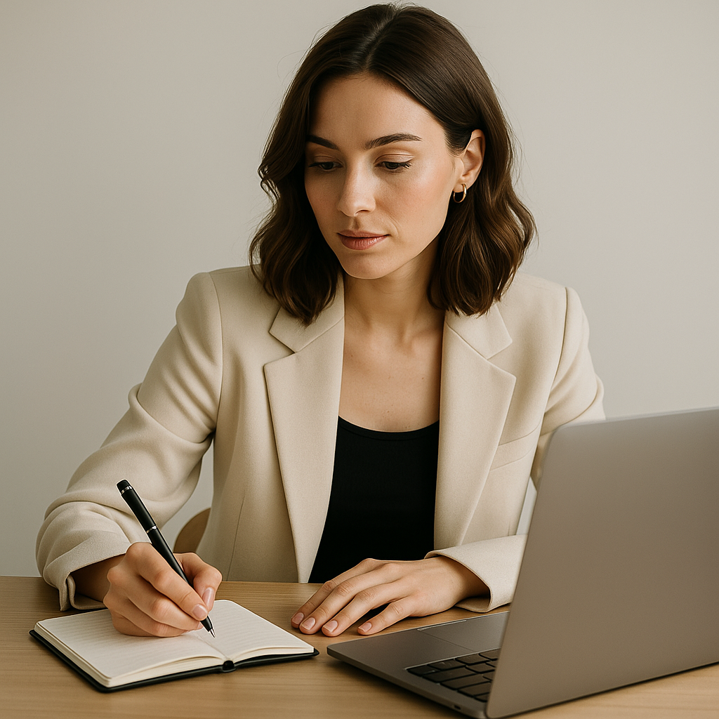 Woman Taking Notes While Working on Laptop in Minimalist Style