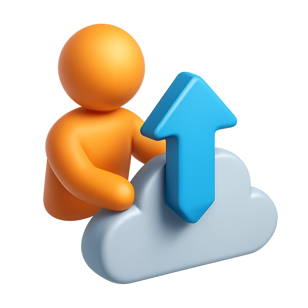 /Collection: /by davooda/Type: PNG/A vibrant 3D icon depicting a stylized figure in an orange hue interacting with a blue upward arrow, symbolizing an upload action above a cloud shape, all set against a dark background.