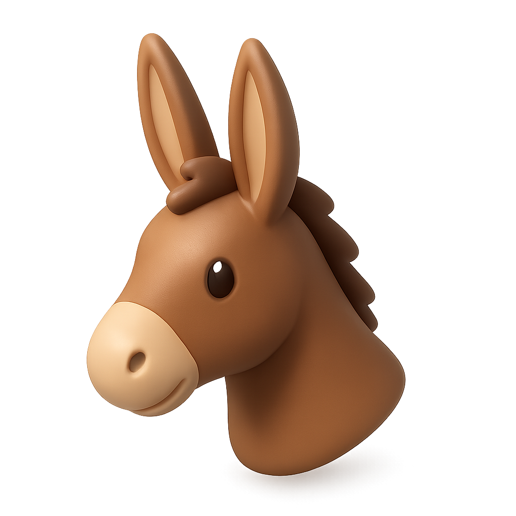 A stylized 3D icon of a donkey's head featuring long ears and a friendly expression. The design is presented in a three-quarter view with a smooth, volumetric look against a soft gradient background.