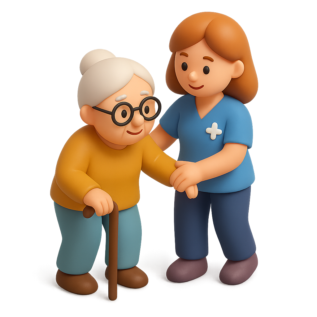 /Collection: /by davooda/Type: PNG/A colorful 3D illustration of an elderly woman with glasses using a cane, accompanied by a caregiver in a blue uniform. The scene is designed with a transparent background and presents a warm, friendly atmosphere.