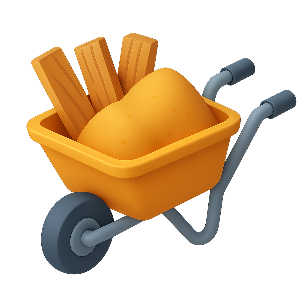 A vibrant 3D cart icon featuring a yellow wheelbarrow filled with wooden planks and a large potato-like object, presented in a three-quarter isometric view.