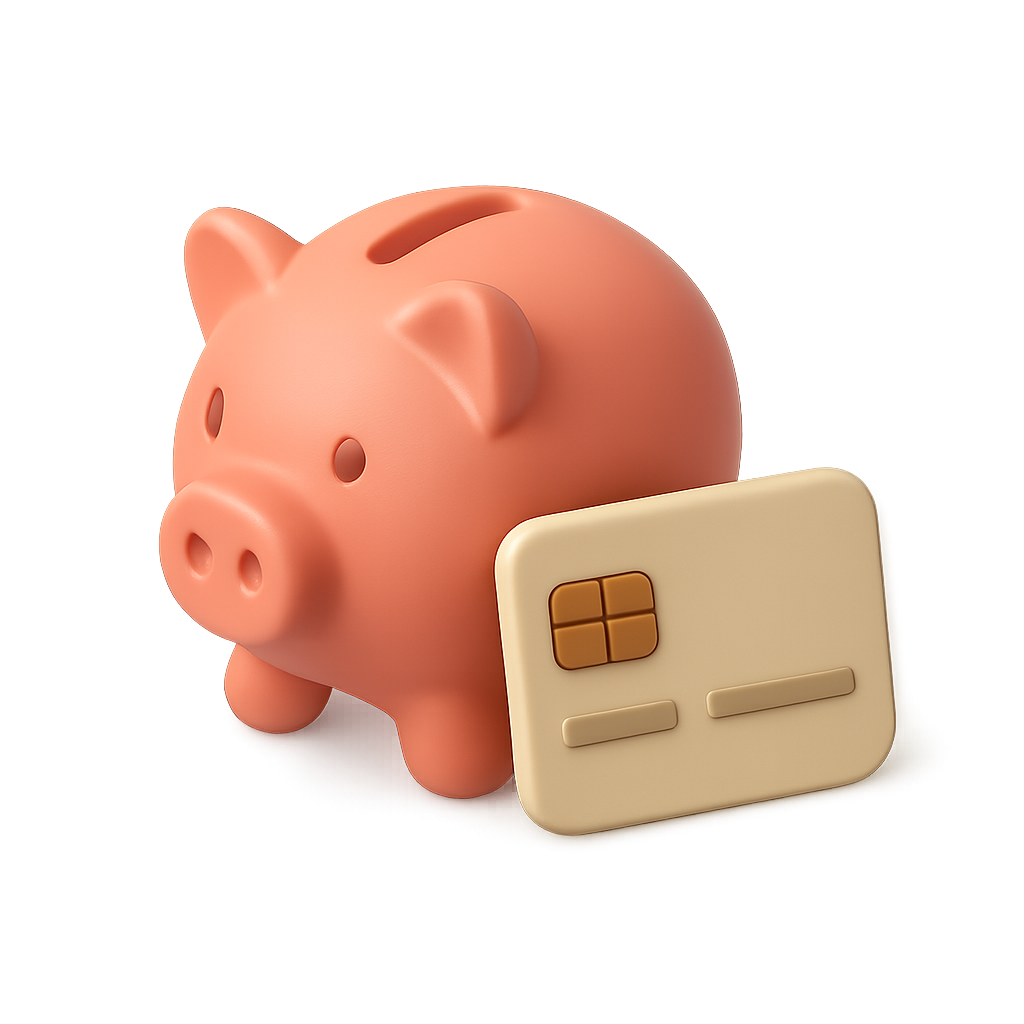 A stylized 3D piggy bank in a soft pink hue, accompanied by a credit card. The design features a three-quarter view with a smooth, volumetric appearance, set against a subtle gradient background.