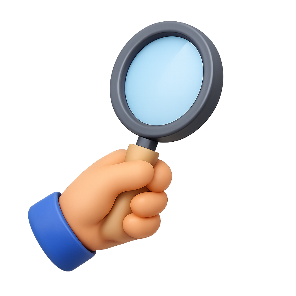 This image features a 3D magnifying glass held by a cartoonish hand. The glass has a soft blue lens and is designed with a modern, isometric style, creating a volumetric appearance.