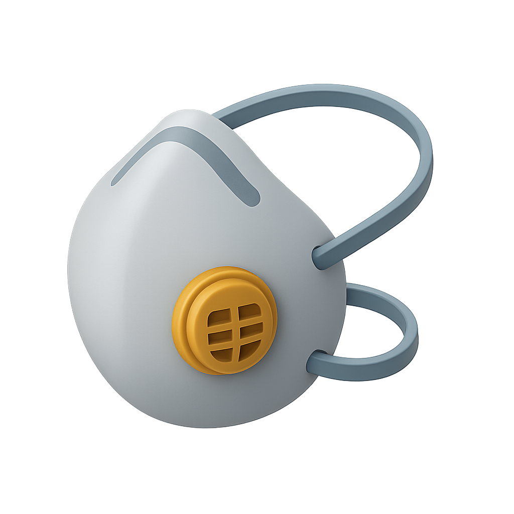 A detailed 3D representation of a dust mask featuring a prominent filter, designed in a three-quarter view on a transparent background, showcasing a modern and volumetric style.